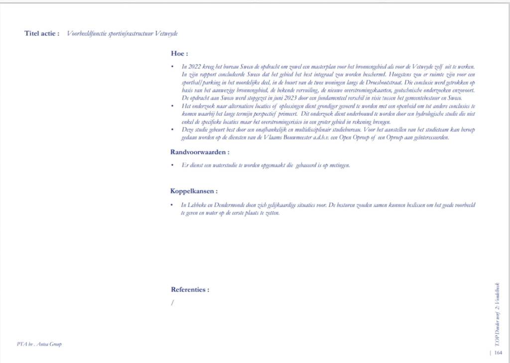 - de overstromingsgevoeligheid: “De Vetweyde is een erkend overstromingsgevoelig gebied dat essentieel is voor het reguleren van piekafvoeren en wateropvang bij hevige regenval. De bouw van een sportcomplex zou leiden tot verdere verharding en een aanzienlijke vermindering van de waterbergingscapaciteit, wat de bestaande overstromingsrisico’s voor omliggende gebieden zou vergroten.”